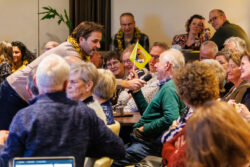 Om te kijken wat er allemaal leeft onder de aanwezigen werd er gestart met een spel: er werden vragen gesteld en dan moest de vlag omhoog worden gedaan als je daar een antwoord op had. De vragen waren o.a. wie er voor de eerste keer op de Nieuwjaarsreceptie was, wie er langer dan 10 jaar in Tollebeek woonde, liever koffie of thee dronk, wie er actief is bij een vereniging in Tollebeek en zo nog wat meer vragen. Jan Hermsen liep door de zaal met een microfoon om bij de mensen dan even een praatje te maken.