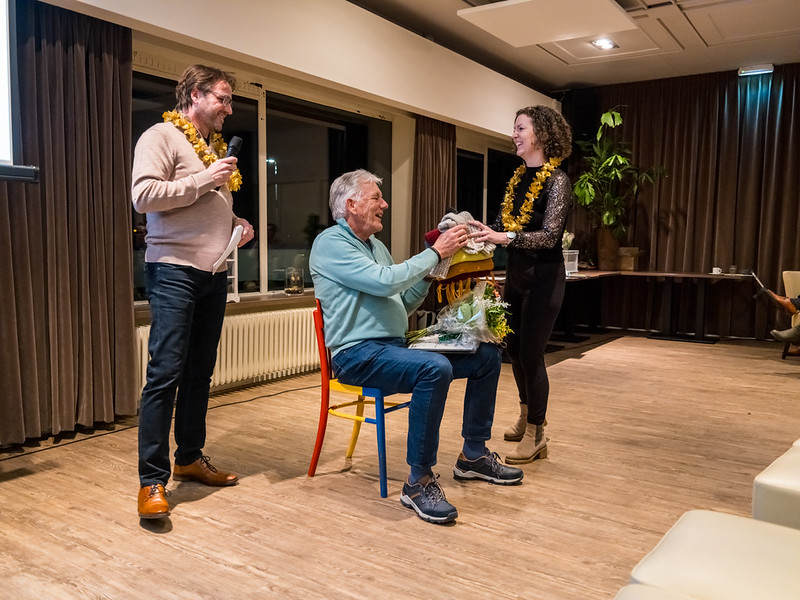 Toen was het tijd voor De Stoel, hierop komt een bewoner van Tollebeek die veel doet voor ons dorp. Dit jaar was De Stoel voor Joop Gort. Hij houdt al jaren met trekker en grasmaaier het gras kort van het rondje Tollebeek, actief met de Jachtweide, de Bazuin rondbrengen op de fiets en altijd bereid om te helpen. Naast een bos bloemen van Dorpsbelang Tollebeek kreeg hij ook een sjaal en sokken gebreid door mevrouw Fokkema zelf.