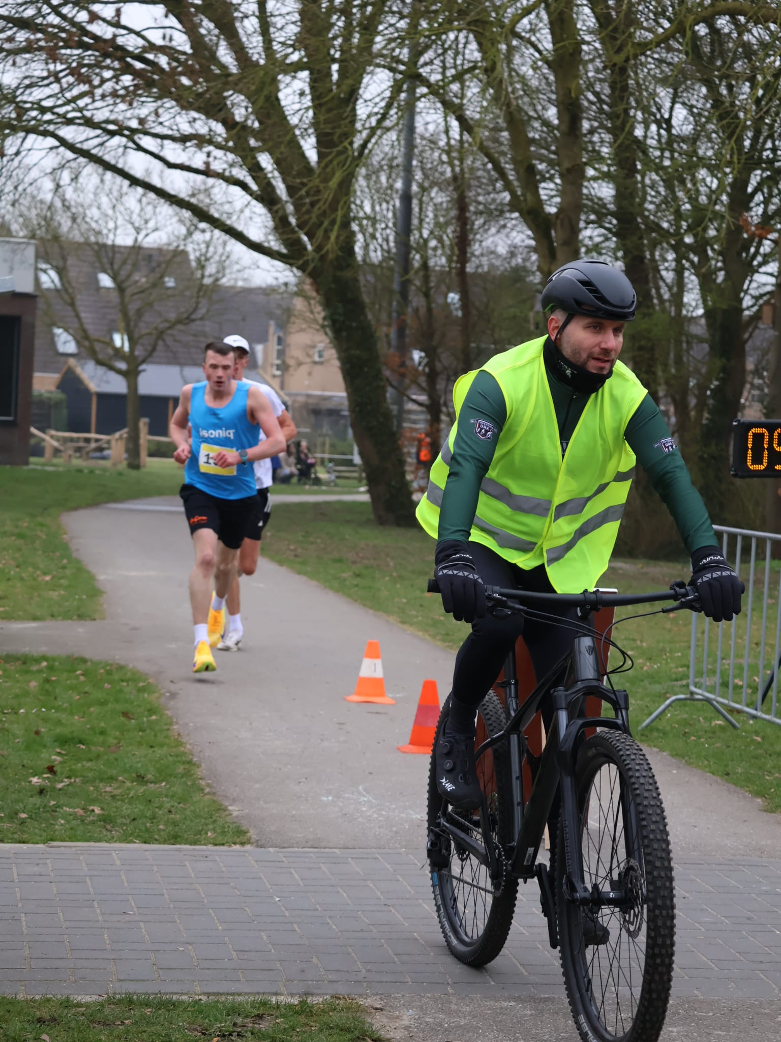 De 67 deelnemers schoten ervandoor, zowel de volwassenen als de kinderen. De snelste loper werd begeleid door een fietser die voor hem uit fietste. Inmiddels kwam moeizaam de zon door de wolken en werd de temperatuur voor het aanwezige publiek en de verkeersregelaars en de motivatoren op het parcours iets behaaglijker.